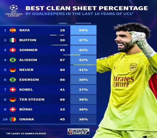 北京时间12月11日,德转列出了欧冠近10年出战至少25场比赛的门将零封率前10,阿森纳的戴维-拉亚以54%的零封率高居第一,布冯47%排名第二,索默和阿利松同以42%的零封率并列第三,奥纳纳36%上榜。