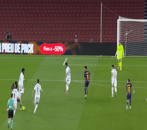 整个上半场,比赛几乎完全呈现一边倒,客场作战的奥萨苏纳只有在开场的几分钟,阵型相对激进。随后“541”的站位全面回防,三条线的距离非常小,禁区附近组成了密集的阵型,不给巴萨渗透的机会。