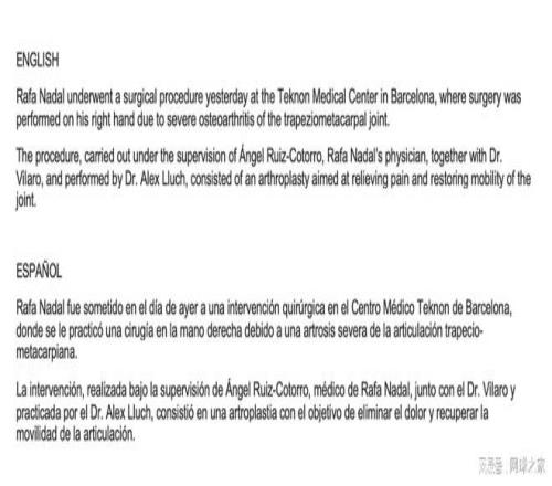 随公告一同发布的官方声明写道:“纳达尔昨日在巴塞罗那的Teknon医疗中心接受了手术。由于右手拇指腕掌关节严重骨关节炎,他接受了手术治疗。该手术在纳达尔主治医生安赫尔·鲁伊斯-科托罗与维拉罗医生的监督下进行,由亚历克斯·柳奇医生主刀,采用关节成形术,旨在缓解疼痛并恢复关节活动能力。”